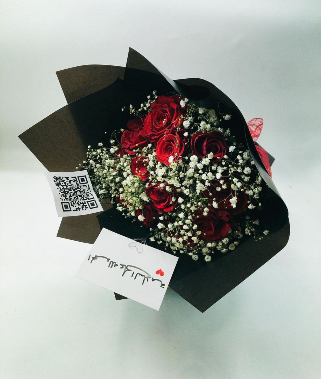 باقة من الزهور الحمراء مع ورد الجيبسو الأبيض، ملفوفة بغلاف أسود، تجمع بين الأناقة والرفاهية لمظهر عصري وفاخر